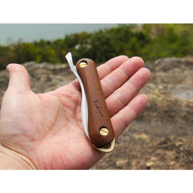 ポケットやサコッシュにミニマムに収まる 掌サイズのフォールディングナイフ 【3つの特徴】 1:小さくても切りやすい形状、選べるハンドル材 折り畳める包丁をコンセプトとした、折畳式料理ナイフの形状をヤマ飯ナイフにも採用。 山に持ち出せる携帯性と包丁の操作性を両立する切りやすくてコンパクトなナイフです。 サイズが小さくなることで見失うことを軽減するために、首やバッグから下げれる真鍮製のランヤードホールがついております。 2:メンテナンスしやすい構造 フォールディングナイフの弱点と言える「ブレードを折り畳んだ内部のメンテナンスが困難」な問題がありますが、ヤマ飯ナイフの構造は非常にシンプルで、付属の板ドライバーでネジを緩め、ハンドルを外し簡単にメンテナンスすることが出来ます。 お肉や魚を裁いた後に肉片が入ったまま。なんてことがありません。 3:日本の職人が仕上げた「最高の切れ味」 プロの料理人が使用する包丁にも使われている日立金属のステンレス鋼「銀紙三号」を使用しております。 主にプロの料理人向け和包丁の鋼材として使われています。炭素を含んでいるのでまったく錆びないというわけではありませんが、炭素とクロムのほどよい含有量が生む硬度により、鋭い切れ味を発揮します。ハンドル材:イペ イペは南米原産の広葉樹で、港湾や岸壁のウッドデッキの材料に使われるなど、人の往来の激しい場所に耐えうる強度、水のかかるような条件の悪い場所でも高い耐久性を誇る木です。重量、高度もあり、重厚な質感が特徴です。 ※ナイフ刃物類の販売に関して -ナイフ・刃物類は18歳未満の方へは販売しておりません。 -刃物を正当な理由なく携帯するくことは法律によって禁止されています。 -販売は登山・キャンプなど正当な仕様目的を有した方のみとさせていただきます (銃砲刀剣類所持等取締法第22条) |