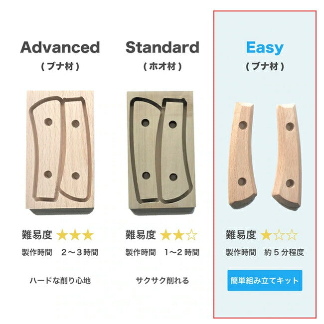 It's my knife Craft Easyは塗装やウッドバーニングといったカスタマイズを楽しむことを主眼においた、今までにない新しいコンセプトのナイフキット。 面取り加工が施されており、組み立てるだけでも完成できる手軽さもポイント。 はじめての方でも手軽に自分だけのオリジナルナイフを作ることができます。 【用途】 木削りをはじめ、工作全般に使えるクラフトナイフ 【キットの内容】 クラフトナイフ×1本 ハンドル用の木材(ブナの木)×1組 組ネジ(真鍮)×2組 サンドペーパー(#120・#240)×各1枚 板ドライバー×1枚 ナイフシース(合皮)×1 つくりかた説明書×1 【特徴】 ハンドルをつくって楽しむナイフキット ハンドル材には質感の良いブナを使用。 【所要時間】 約5分 【つくりかた】 加工済みのハンドル(ブナ)と刃を組み合わせるだけで完成。 木は素地のままなので、塗装やオイル加工など、好みに合わせて加工をお楽しみください!※安来鋼の青紙は、水分をしっかり除去せず放置すると錆が発生することがあります。 ※こちらの商品はお客様に組み立てを行っていただく自作キットです。 ※完成品ではございません。 ※製作時は必ず付属の「つくりかた説明書」をご覧ください。 ※ナイフ自作キット以外の工具、オイル、ワックスなどは商品には付属いたしません。 予めご了承ください。 ※ナイフ刃物類の販売に関して -ナイフ・刃物類は18歳未満の方へは販売しておりません。 -刃物を正当な理由なく携帯するくことは法律によって禁止されています。 -販売は登山・キャンプなど正当な仕様目的を有した方のみとさせていただきます (銃砲刀剣類所持等取締法第22条) |