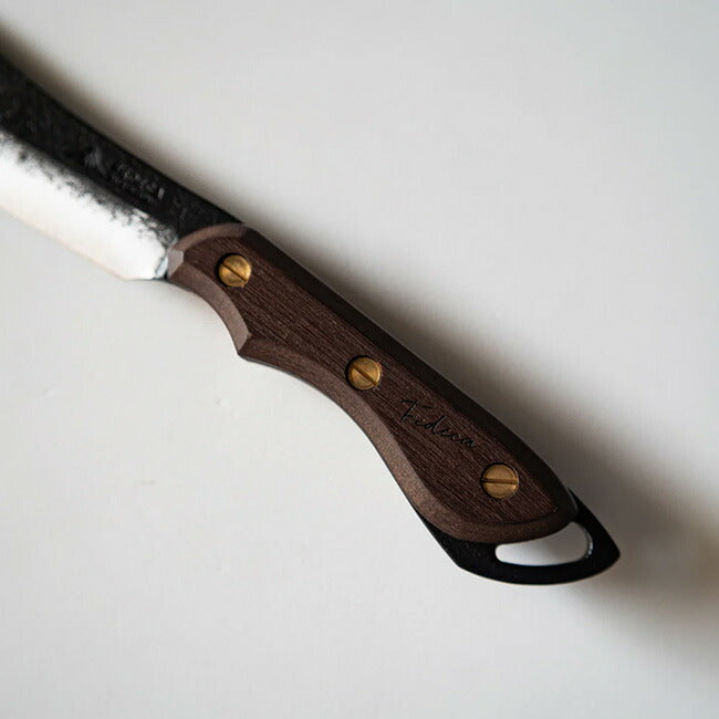 家族みんなで焚火を楽しめる、新発想のフルタング鉈(なた)。 キャンプの楽しみの一つといえば焚火(たきび)。 中でも、ナイフで薪(まき)を小さく割るバトニングから、それを表面を羽の形のように薄く削り重ねて火をつけるフェザースティックまでを、ナイフ一本で行うことが焚火の醍醐味です。 「家族みんなで焚火を楽しむ。」 ありそうでなかったコンセプトの焚火専用の鉈を作りました。 こだわりのポイント5つをご紹介します! 【Point1:先端の突起で、刃が欠けにくい】 皆様に安心にお使いいただくために、私たちは先端に刃を保護する石突(いしづき)という突起を設けました。 【Point2:先端がとがっていなくて、怪我をしにくい】 バトニングの際に、挟まった刃を抜こうとして、誤ってナイフの先端や鉈の刃先で怪我をしそうになったことありませんか? 鍛造バトニング鉈では先端が尖っておらず丸みを帯びているので、怪我をするリスクが少ないのも安心です。 【Point3:6mmの極厚鍛造ブレードで気持ちよく割れる】 刃厚が6mmもあるのは、バトニング用の刃物の中ではかなり厚い部類に入ります。 厚みをもたせることで、薄い刃に比べ、薪を左右に押し広げやすいので、軽い力で薪を割ることができます。 更に、刃の断面は、外側にハマグリのようにすこし丸みを帯びた「ハマグリ刃」になっており、強度が高く刃こぼれしにくい。 木を割る力が強いです。 【Point4:折れる心配がない、頑丈なフルタング構造】 刃先からハンドル部分まで鋼が入ったフルタング構造なら、おもいっきり叩いても大丈夫! 折れる心配が少なく、とても堅牢。 安心して使えます。 素材には、硬く靭性の高いシリコンマンガン鋼を使用。 耐衝撃性の求められる耕運機の爪や、自動車の板バネなどに使用されている特殊鋼材。 巨大プレス機の600トンの衝撃による熱間鍛造でとても強靭なブレードに仕上げました。 【Point5:絶妙な重心バランスで気持ちよく削れる】 「鍛造バトニング鉈」では、全体の重心を中心部にとることで、刃先の適度な重みを使って、少ない力でスーッと木を削ることができ、また、ハンドル側に適度な重みがあるので、ヘッドコントロールもしやすいので、繊細なフェザーを作ることを可能にしました。 全長24.5cmとナイフのようなコンパクトさも扱いやすいポイントです。 【重量】 約300g 【素材】 刃:シリコンマンガン鋼 柄:積層強化木(カルナバワックス仕上げ) ネジ:真鍮 【レザーケース】 カラー:ブラック ※ナイフ刃物類の販売に関して※ ●ナイフ・刃物類は18歳未満の方へは販売しておりません。 ●刃渡り60mm以上のナイフを、正当な理由なく携帯することは法律によって禁止されています。 ●販売は登山・キャンプなど正当な使用目的を有した方のみとさせていただきます。 (銃砲刀剣類所持等取締法第22条) |