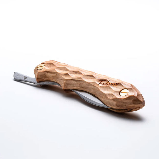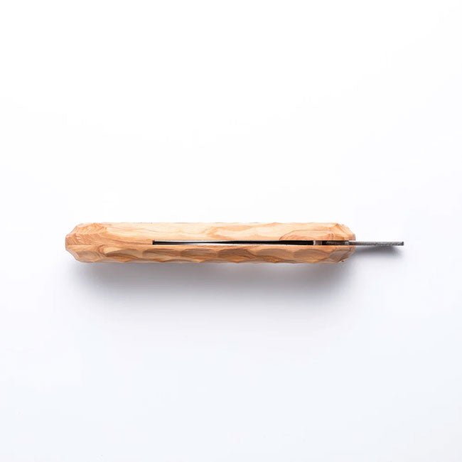 「折り畳める包丁」がコンセプトのキャンプ料理が楽しくなるナイフ。 【主な特徴3つ】 1、ナイフなのに刻みやみじん切りができる。 ナイフの強みは万能性にあります。 刃幅が狭いので、バターナイフとして、 ステーキナイフとして食卓のちょっとした作業や、木を削ったり、紙を切ったりといった作業などマルチに使えます。 また折りたためば携帯性に優れているのもその大きな利点。 一方で、包丁のように顎が無く、引切りしか出来ないため、本格的な調理は包丁に分があります。 2、抜群の携帯性 特にキャンプでは、道具はなるべく少なく、こだわった物を持ちたいもの。 刃を折りたたんでコンパクトに、かつ安全に持ち運ぶことができる、このナイフがおすすめです。 3、お手入れが簡単 ナイフには珍しく包丁と同じ刃付け角度を採用しているので、市販の包丁用シャープナーで手軽に切れ味が復活できるのもうれしいですね。 砥石で研ぐこともできます。 ネジを外して分解するだけで内部の掃除も簡単にできます。 刃の開閉調整もドライバー一つで簡単に調整できます。 【重量】 約65g 【素材】 刃:両刃3層の割込み(芯材/安来鋼銀紙三号・外層/ステンレス) 柄:オリーブ ネジ:真鍮ネジ 【持ち手】 名栗オリーブ 柄の部分には板や柱に「ちょうな」で削り跡をのこす名栗加工。 日本古来から伝わる躍動感あふれるフォルムを機械加工で表現しました。 素材にはオリーブを使用しています。 ※ナイフ刃物類の販売に関して※ ●ナイフ・刃物類は18歳未満の方へは販売しておりません。 ●刃渡り60mm以上のナイフを、正当な理由なく携帯することは法律によって禁止されています。 ●販売は登山・キャンプなど正当な使用目的を有した方のみとさせていただきます。 (銃砲刀剣類所持等取締法第22条) |