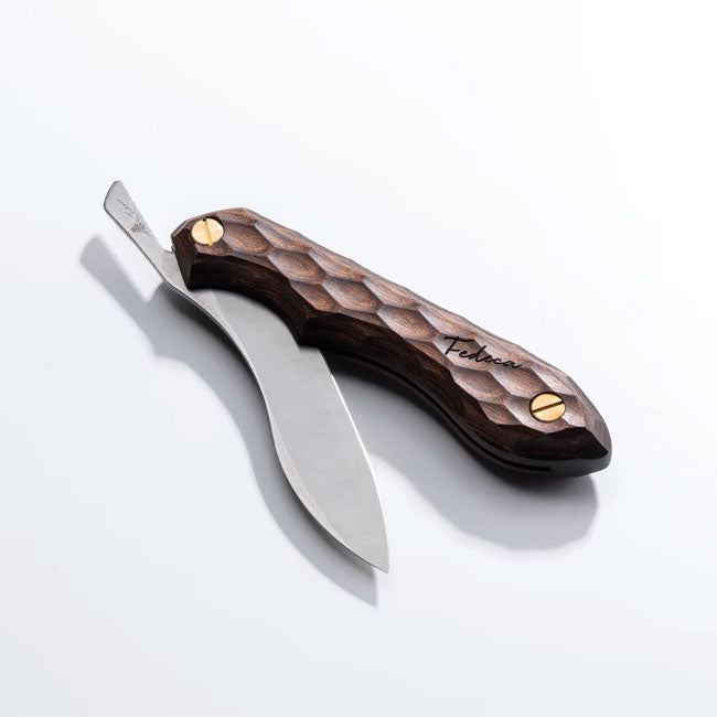 「折り畳める包丁」がコンセプトのキャンプ料理が楽しくなるナイフ。 【Point1:ナイフなのに刻みやみじん切りができる】 ナイフの強みは万能性にあります。 刃幅が狭いので、バターナイフとして、 ステーキナイフとして食卓のちょっとした作業や、木を削ったり、紙を切ったりといった作業などマルチに使えます。 また折りたためば携帯性に優れているのもその大きな利点。 一方で、包丁のように顎が無く、引切りしか出来ないため、本格的な調理は包丁に分があります。 そこで私たちはナイフをカーブ形状にすることで、包丁に近い使用感を実現しました。 押切りしても人差し指が当たらず、カットしやすい。 そして持ち手が切断部よりも上にくるので力が入れやすく、刻みやみじん切りも難なくこなせます。 アウトドアに限らず、食卓でのちょっとした作業にも。 折りたためて安全なので、ご家庭でも重宝します。 【Point2:抜群の携帯性】 特にキャンプでは、道具はなるべく少なく、こだわった物を持ちたいもの。 そんな皆様に、刃を折りたたんでコンパクトに、かつ安全に持ち運ぶことができる、このナイフがおすすめです。 別売りの専用ケースに入れれば、もっとスマートに。 【Point3:お手入れが簡単】 ナイフには珍しく、包丁と同じ刃付け角度を採用しているので、市販の包丁用シャープナーで手軽に切れ味が復活します。 もちろん、砥石で研ぐこともできます。 また、キットをルーツとした、誰でも簡単に組立できるシンプル構造のため、ネジを外して分解するだけで内部の掃除も簡単にできます。 さらにドライバー1つで、刀の開閉調整を行うことが可能です。 【重量】 84g 【素材】 刃:両刃 3層の割込み(芯材/安来鋼銀紙三号、外層/ステンレス) 柄:積層強化木 ネジ:真鍮 ※ナイフ刃物類の販売に関して※ ●ナイフ・刃物類は18歳未満の方へは販売しておりません。 ●刃渡り60mm以上のナイフを、正当な理由なく携帯することは法律によって禁止されています。 ●販売は登山・キャンプなど正当な使用目的を有した方のみとさせていただきます。 (銃砲刀剣類所持等取締法第22条) |