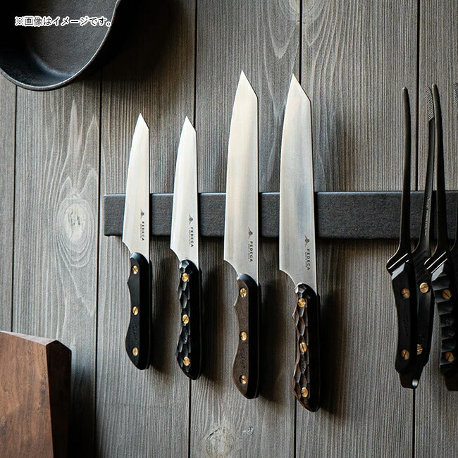折畳式料理ナイフをお使いのアウトドアラバーな皆様から「もう少し刃渡りの長いものも欲しい!」という声を多く頂いておりました。 特に料理にこだわりある皆様にとっては普段使いできる包丁を、スタイリッシュに持ち出すことができたら嬉しいですよね。 そんな皆様にご提案したいのが、FEDECA「三徳包丁」。 スタイリッシュに持ち運ぶことを軸に置いたプロ仕様の家外共用の包丁です。 【Point1:抜群の切れ味でメンテナンス性もGOOD! アフターフォローも充実】 ブレードの鋼材には日本製の高機能ステンレスAUS8を採用。 医療用のメスやナイフなどにも用いられ、錆などに強い耐蝕性をもつ非常に研ぎやすく、扱いやすい鋼材です。 一般のステンレス鋼に比べ、切れ味は長続きするのが特徴です。 【Point2:お気に入りのトングやナイフとコーディネートを楽しめる】 ハンドルには水に強い積層強化木を採用。 【刃のお手入れ】 刃を長く使っていただくには、錆対策が必須です。 包丁にはステンレス鋼を使用しており、炭素鋼に比べ錆びにくさはありますが、全く錆びないわけではありません。 使用後は水分をしっかり拭き取り、椿油などの防錆油を施して頂けると長く使っていただくことができます。 【ハンドルのお手入れ】 出荷時、ハンドルの木材には、FEDECA特製カルナバワックスを塗布しております。 このカルナバワックスに使用される「カルナバ蝋」は植物性の蝋の中で硬度・融点(溶け出す温度)ともに最も高く、自動車用ワックスにも使用されるほどの強度がある天然成分100%のワックスです。 使っていて表面が乾いてきたり、撥水効果が薄れてきたなと感じた時、こちらのワックスや市販の木製品用のワックスを塗布していただければまた元の艶を取り戻すことができます。 塗り重ねれば重ねるほどに、保護効果は高くなりますのでご使用のたびに塗っていただいても大丈夫です。 ※ハンドルを固定しているネジには緩み止め剤を使用しております。 ※ネジを無理に回すとネジの溝がつぶれる恐れがあるため、分解は行わないでください。 【素材】 刃:AUS8 柄:積層強化木 ネジ:真鍮 ※ナイフ刃物類の販売に関して※ ●ナイフ・刃物類は18歳未満の方へは販売しておりません。 ●刃渡り60mm以上のナイフを、正当な理由なく携帯することは法律によって禁止されています。 ●販売は登山・キャンプなど正当な使用目的を有した方のみとさせていただきます。 (銃砲刀剣類所持等取締法第22条) |