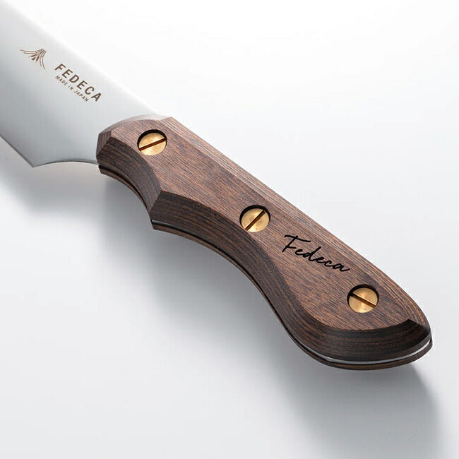 折畳式料理ナイフをお使いのアウトドアラバーな皆様から「もう少し刃渡りの長いものも欲しい!」という声を多く頂いておりました。 特に料理にこだわりある皆様にとっては普段使いできる包丁を、スタイリッシュに持ち出すことができたら嬉しいですよね。 そんな皆様にご提案したいのが、FEDECA「三徳包丁」。 スタイリッシュに持ち運ぶことを軸に置いたプロ仕様の家外共用の包丁です。 【Point1:抜群の切れ味でメンテナンス性もGOOD! アフターフォローも充実】 ブレードの鋼材には日本製の高機能ステンレスAUS8を採用。 医療用のメスやナイフなどにも用いられ、錆などに強い耐蝕性をもつ非常に研ぎやすく、扱いやすい鋼材です。 一般のステンレス鋼に比べ、切れ味は長続きするのが特徴です。 【Point2:お気に入りのトングやナイフとコーディネートを楽しめる】 ハンドルには水に強い積層強化木を採用。 【刃のお手入れ】 刃を長く使っていただくには、錆対策が必須です。 包丁にはステンレス鋼を使用しており、炭素鋼に比べ錆びにくさはありますが、全く錆びないわけではありません。 使用後は水分をしっかり拭き取り、椿油などの防錆油を施して頂けると長く使っていただくことができます。 【ハンドルのお手入れ】 出荷時、ハンドルの木材には、FEDECA特製カルナバワックスを塗布しております。 このカルナバワックスに使用される「カルナバ蝋」は植物性の蝋の中で硬度・融点(溶け出す温度)ともに最も高く、自動車用ワックスにも使用されるほどの強度がある天然成分100%のワックスです。 使っていて表面が乾いてきたり、撥水効果が薄れてきたなと感じた時、こちらのワックスや市販の木製品用のワックスを塗布していただければまた元の艶を取り戻すことができます。 塗り重ねれば重ねるほどに、保護効果は高くなりますのでご使用のたびに塗っていただいても大丈夫です。 ※ハンドルを固定しているネジには緩み止め剤を使用しております。 ※ネジを無理に回すとネジの溝がつぶれる恐れがあるため、分解は行わないでください。 【素材】 刃:AUS8 柄:積層強化木 ネジ:真鍮 ※ナイフ刃物類の販売に関して※ ●ナイフ・刃物類は18歳未満の方へは販売しておりません。 ●刃渡り60mm以上のナイフを、正当な理由なく携帯することは法律によって禁止されています。 ●販売は登山・キャンプなど正当な使用目的を有した方のみとさせていただきます。 (銃砲刀剣類所持等取締法第22条) |