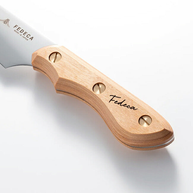 折畳式料理ナイフをお使いのアウトドアラバーな皆様から「もう少し刃渡りの長いものも欲しい!」という声を多く頂いておりました。 特に料理にこだわりある皆様にとっては普段使いできる包丁を、スタイリッシュに持ち出すことができたら嬉しいですよね。 そんな皆様にご提案したいのが、FEDECA「三徳包丁」。 スタイリッシュに持ち運ぶことを軸に置いたプロ仕様の家外共用の包丁です。 【Point1:抜群の切れ味でメンテナンス性もGOOD!アフターフォローも充実】 ブレードの鋼材には日本製の高機能ステンレスAUS8を採用。 医療用のメスやナイフなどにも用いられ、錆などに強い耐蝕性をもつ非常に研ぎやすく、扱いやすい鋼材です。 一般のステンレス鋼に比べ、切れ味は長続きするのが特徴です。 【Point2:お気に入りのトングやナイフとコーディネートを楽しめる】 ハンドルには水に強い積層強化木を採用。 【刃のお手入れ】 刃を長く使っていただくには、錆対策が必須です。 包丁にはステンレス鋼を使用しており、炭素鋼に比べ錆びにくさはありますが、全く錆びないわけではありません。 使用後は水分をしっかり拭き取り、椿油などの防錆油を施して頂けると長く使っていただくことができます。 【ハンドルのお手入れ】 出荷時、ハンドルの木材には、FEDECA特製カルナバワックスを塗布しております。 このカルナバワックスに使用される「カルナバ蝋」は植物性の蝋の中で硬度・融点(溶け出す温度)ともに最も高く、自動車用ワックスにも使用されるほどの強度がある天然成分100%のワックスです。 使っていて表面が乾いてきたり、撥水効果が薄れてきたなと感じた時、こちらのワックスや市販の木製品用のワックスを塗布していただければまた元の艶を取り戻すことができます。 塗り重ねれば重ねるほどに、保護効果は高くなりますのでご使用のたびに塗っていただいても大丈夫です。 ※ハンドルを固定しているネジには緩み止め剤を使用しております。 ※ネジを無理に回すとネジの溝がつぶれる恐れがあるため、分解は行わないでください。 【素材】 刃:AUS8 柄:積層強化木 ネジ:真鍮 ※ナイフ刃物類の販売に関して※ ●ナイフ・刃物類は18歳未満の方へは販売しておりません。 ●刃渡り60mm以上のナイフを、正当な理由なく携帯することは法律によって禁止されています。 ●販売は登山・キャンプなど正当な使用目的を有した方のみとさせていただきます。 (銃砲刀剣類所持等取締法第22条) |
