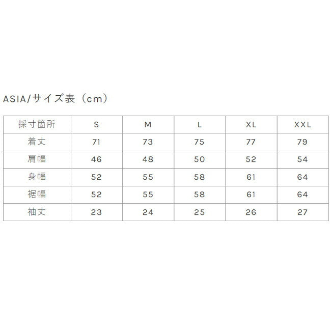 サイズ | M:着丈73 肩幅48 身幅55 裾幅55 袖丈24 L:着丈75 肩幅50 身幅58 裾幅58 袖丈25 XL:着丈77 肩幅52 身幅61 裾幅61 袖丈26 (単位:cm) ※メーカーサイズ参照 |