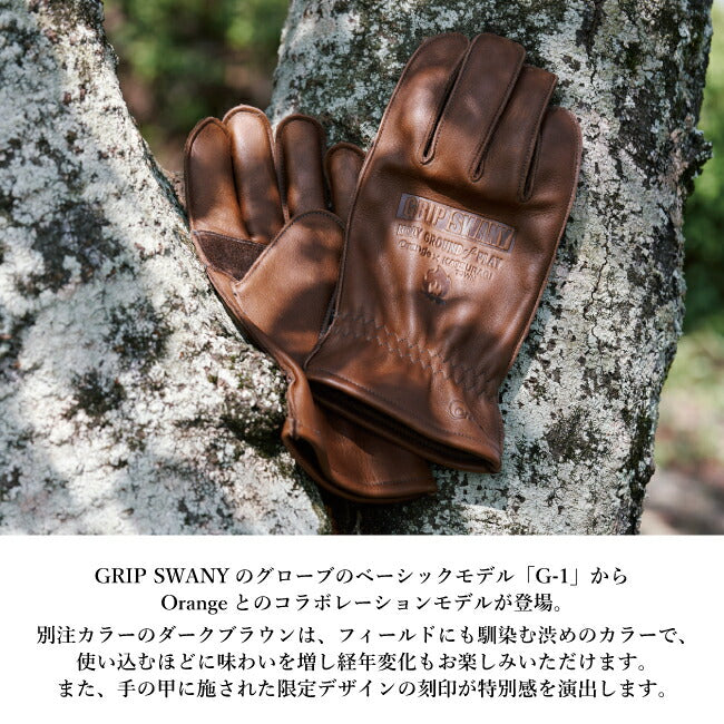 GRIP SWANY ベーシックモデル「G-1」のコラボレーションモデル。 フィールドにも馴染む渋めのカラーで、使い込むほどに味わいを増し経年変化もお楽しみいただけます。 また、手の甲に施された限定デザインの刻印が特別感を演出します。【素材】 牛皮革 |