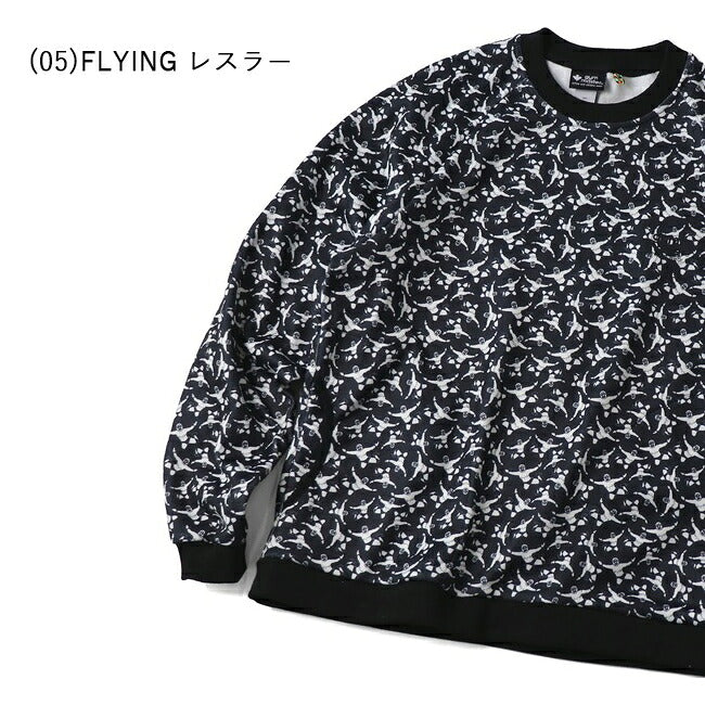 おさえたカラーで総柄プリントをほどこしたクルーネック