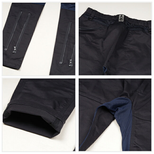 膝裏、股下、腰裏の通気性を快適にするためにメッシュ素材を2種類使っています。