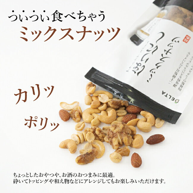 クルミ加工品(クルミ(アメリカ)、スパイス調味料、植物油)、ピーナッツ加工品(ピーナッツ、植物油、スパイス調味料、食塩)、カシューナッツ加工品(カシューナッツ、スパイス調味料、植物油)、アーモンド加工品(アーモンド、スパイス調味料、植物油)/調味料(アミノ酸等)、リン酸Ca、(一部にクルミ・小麦・落花生・アーモンド・カシューナッツ・大豆・鶏肉・豚肉を含む)