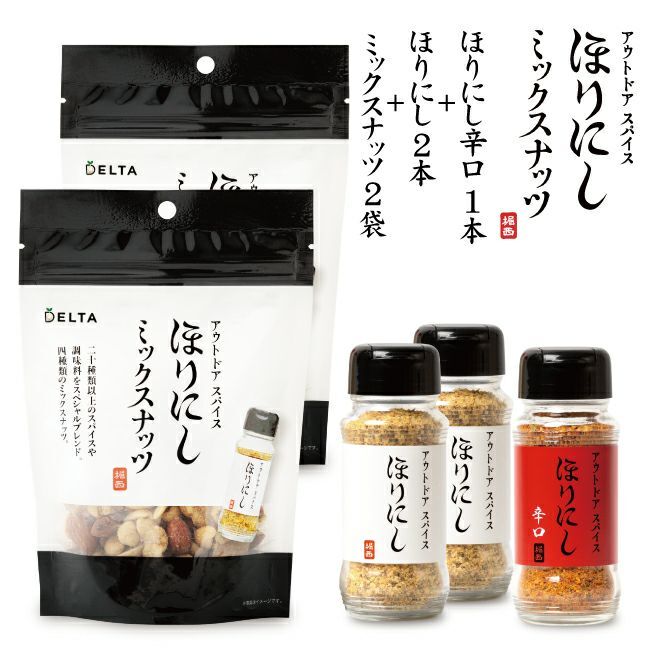 商品名 | アウトドアスパイス ほりにし ミックスナッツ 2個+「アウトドアスパイス ほりにし」2本+「アウトドアスパイス ほりにし辛口」1本 |