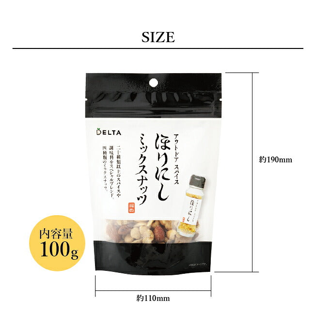 アウトドアスパイス ほりにし×4種類のミックスナッツ 【セット内容】 アウトドアスパイス ほりにし ミックスナッツ2個 「アウトドアスパイス ほりにし」2本 「アウトドアスパイス ほりにし辛口」1本 ★アウトドアスパイス ほりにし ミックスナッツ★ 【原材料名】 クルミ加工品(クルミ(アメリカ)、スパイス調味料、植物油)、ピーナッツ加工品(ピーナッツ、植物油、スパイス調味料、食塩)、カシューナッツ加工品(カシューナッツ、スパイス調味料、植物油)、アーモンド加工品(アーモンド、スパイス調味料、植物油)/調味料(アミノ酸等)、リン酸Ca、(一部にクルミ・小麦・落花生・アーモンド・カシューナッツ・大豆・鶏肉・豚肉を含む) 【内容量】 100g 【栄養成分表示(100g当り・推定値)】 エネルギー:643kcal たんぱく質:18.7g 脂質:56.2g 炭水化物:19.1g 糖質:12.1g 食物繊維:7.0g 食塩相当量:1.5g 【賞味期限】 別途商品ラベルに記載 【保存方法】 直射日光、高温多湿を避けて保存してください。 ナッツは暑さに弱い特性を持っています。 酸化を防ぐためにできるだけ涼しいところで保存してください。 ●お子様が召し上がる際は、のどに詰まらせないようご注意ください。 ●当製造工場では、えび、かに、卵、乳成分、いか、オレンジ、キウイフルーツ、牛肉、ごま、さけ、さば、ゼラチン、バナナ、もも、やまいも、りんごを含む製品を製造しております。 ●開封後はしっかりとチャックを閉め、賞味期限にかかわらずお早めにお召し上がりください。 ●まれにナッツの殻が混入していることがありますのでご注意ください。 ●本製品は農産物のため、色や形・硬さにばらつきがあります。 ●まれに虫食いの実が混入していることがあります。 ●ミックス品のため内容にばらつきが出る場合がございます。 ---------------------------------------------------------------- ★アウトドアスパイス「ほりにし」★ 【原材料名】 食塩(国内製造、アメリカ製造、ドイツ製造)、ガーリック、黒コショウ、粉末醤油、赤唐辛子、レッドベルペパー、陳皮、コリアンダー、ミルポアパウダー、植物油脂、チキン調味料、パセリ、パプリカ、オニオン、ジンジャー、バジル、オレガノ、マジョラム、ローズマリー、ローレル、セロリーシード/調味料(アミノ酸等)、リン酸Ca、(一部に小麦、大豆、鶏肉、豚肉を含む) 【内容量】 100g 【栄養成分表示(100g当り・推定値)】 熱量:206kcal たんぱく質:12.8g 脂質:2.8g 炭水化物:32.4g 食塩相当量:46.3g 【賞味期限】 別途商品ラベルに記載 【保存方法】 直射日光、高温多湿を避けて保存してください。 光や日光に長時間当てていると変色の原因となります。(品質には問題ありません) 保管時はなるべく高温多湿を避け、温度差が少なく風通しの良い冷暗所での保管を推奨いたします。 ---------------------------------------------------------------- ★アウトドアスパイス「ほりにし辛口」★ 【原材料名】 食塩(アメリカ製造、国内製造)、赤唐辛子、ガーリック、黒コショウ、陳皮、砂糖、ミルポワパウダー、オニオン、酵母エキス、粉末醤油、パプリカ、チキン調味料、植物油脂、パセリ、青唐辛子、ジンジャー、コリアンダー、バジル、オレガノ、マジョラム、ローズマリー、山椒、ローレル/調味料(アミノ酸等)、リン酸Ca、(一部に小麦・大豆・鶏肉・豚肉を含む) 【内容量】90g 【栄養成分表示(100g当り・推定値)】 熱量:253kcal たんぱく質:13.4g 脂質:4.8g 炭水化物:39.1g 食塩相当量:36.0g 【賞味期限】 別途商品ラベルに記載 【保存方法】 直射日光、高温多湿を避けて保存してください。 光や日光に長時間当てていると変色の原因となります。(品質には問題ありません) 保管時はなるべく高温多湿を避け、温度差が少なく風通しの良い冷暗所での保管を推奨いたします。 ※消費期限がある商品は返品不可とさせていただきます。予めご了承ください。 |
