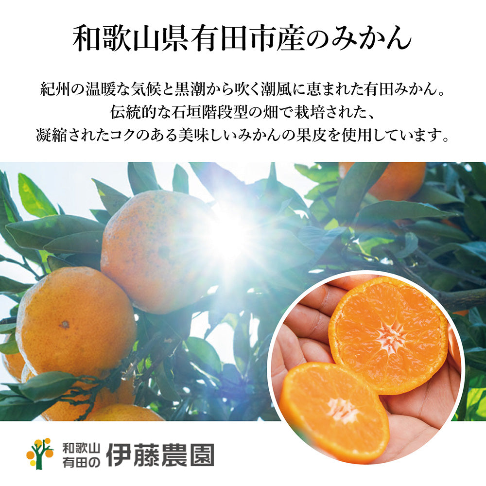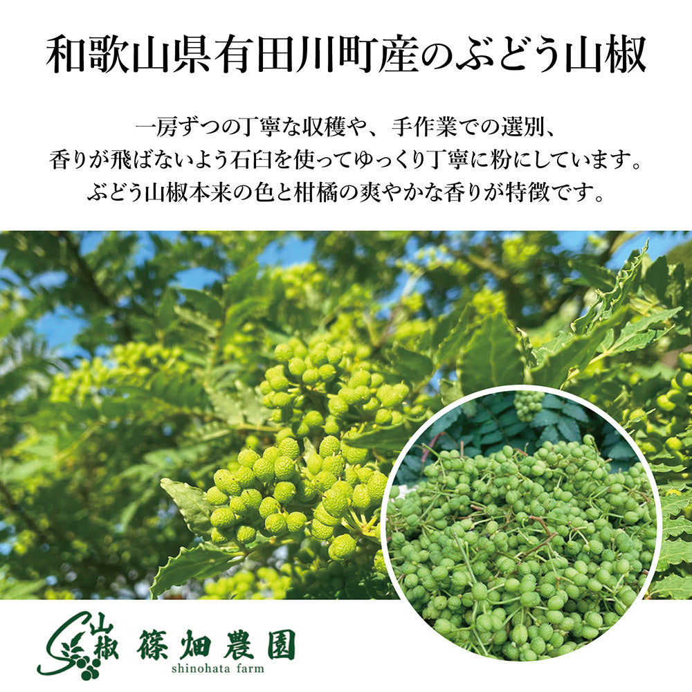 和歌山の篠畑農園の実山椒と伊藤農園のミカンの皮を使用し、昆布やホタテの旨みで味わいを引き立てた、香り豊かで奥深い塩。