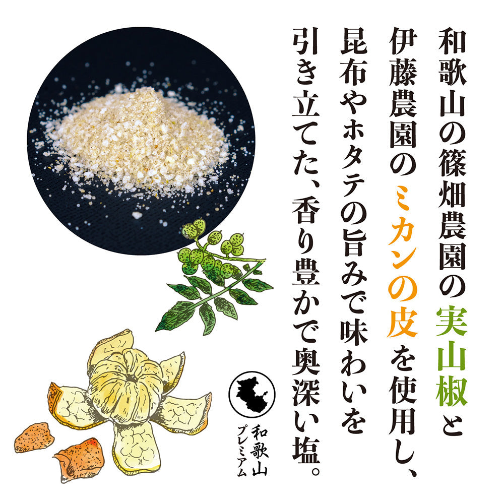 食塩(国内製造)、植物油脂、山椒、みかん果皮、ホタテ調味料、昆布粉末