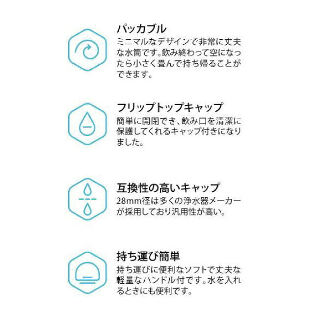 ハイドラパックのポータブルポケットサイズハイドレーション。 とても軽量で耐久性にも優れ、パッキングするのにミニマルなデザインの水筒です。 スピルプルーフノズルは、こぼれにくく行動中でも簡単に飲むことができます。 キャップ径は28mmで多くの浄水器メーカーが採用しており汎用性が高い。 ハンドル付なので持ち運びに、水を入れる時にも便利です。 またこのハンドルを利用して使用後は非常にコンパクトに収納することができます。 2021年より飲み口を清潔に保てるフリップトップキャップが付きました。 ・パッカブル ミニマルなデザインで非常に丈夫な水筒です。 飲み終わって空になったら小さく畳んで持ち帰ることができます。 ・フリップトップキャップ 簡単に開閉でき、飲み口を清潔に保護してくれるキャップ付きになりました。 ・互換性の高いキャップ 28mm径は多くの浄水器メーカーが採用しており汎用性が高い。 ・持ち運び簡単 持ち運びに便利なソフトで丈夫な軽量なハンドル付です。 水を入れるときにも便利です。 ・飲み口、キャップ セルフシーリングシリコンノズル&フリップトップキャップ 【重量】 35g 【容量】 350ml 【素材】 TPU、PP、シリコン |