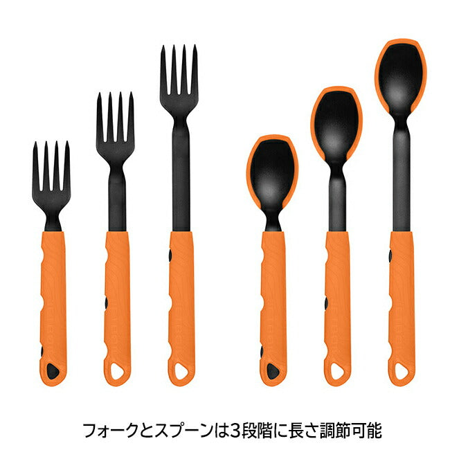 | 重ねてコンパクトに収納が可能な、スプーン、フォーク、ナイフのセットです。 フォークとスプーンは3段階の長さ調節が可能で、深さのあるクッカーやフリーズドライの食品をパッケージからでも食べやすく、調理時のやけどの心配も軽減されます。 また、スプーンはシリコンのエッジをそなえ、クッカーを傷つけることなくきれいにすくえます。 ※食器洗浄機・電子レンジに対応しません。 【重量】 42g ※セットの重量です。 【素材】 ナイロン、シリコーンゴム |
