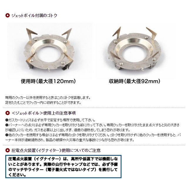 高い火力と高いエネルギー効率を両立させ、0.5リットルの水を約1分40秒で沸騰させる驚異の沸騰スピードを実現したシリーズ最速沸騰モデル。 自動点火装置や、グローブのままでも扱いやすい大型の火力調節つまみ、沸騰を色の変化で知らせるインジケータ、パッキングしやすい形状など「使いやすさ」も兼ね備えています。 また、お湯がそそぎやすい縦長のデザインです。 [ジェットボイル・クッキングシステムについて] クッカーと熱効率の高いストーブがセットになった簡単便利なアウトドア用調理器具。 クッカーの底のフラックスリングが抜群の熱効率を実現しています。 クッカー側面を覆うクロロプレンゴム製のコジー(断熱カバー)によりヒートロスを防ぎ、調理中でもクッカーを素手で扱うことができます。 カートリッジに装着して転倒を防ぐスタビライザーと、専用クッカー以外のクッカーに対応するゴトクが付属します。 ※ガスカートリッジは付属していません。 ※ガスカートリッジは、必ず専用の「ジェットパワー」をご使用ください。 【総重量】440g(ガスカートリッジを除く) 【容量】1.0L 【素材】アルミニウム(カップ本体) 【出力】2269kcal/h 【沸騰到達時間】0.5Lで1分40秒 【ガス消費量】約139g/h ・圧電点火装置(イグナイター)は高所や低温下では機能しないことがあるため、予備のマッチやライター(電子着火式でないタイプ)を携行してください。 ・ガスバーナーとカートリッジを接続する際は、ガスの調節つまみが閉じていることを確認したうえで「水平な場所で、すばやく、確実に」締め付けてください。 ・JETBOILの専用クッカーはバーナー点火後に、液状の食材を入れた上で取付けてください。 (マイティーモは除く) ・JETBOILバーナーで一般的なクッカーを仕様する場合、必ず付属のゴトクを使用してください。 (マイティーモは(除く) ・ガスカートリッジを廃棄する際は、使いきった上で中身のないことを確認し、お住まいの自治体の収集方法に従ってください。 届出事業者名:mont-bell PSマークの種類:PSLPG 登録検査機関名称:JIA |