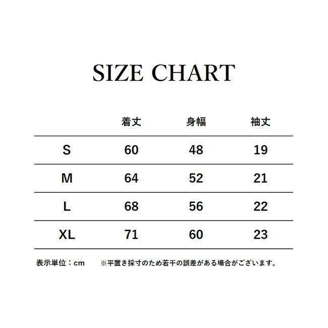 サイズ | S:着丈約60 身幅約48 袖丈約19 M:着丈約64 身幅約52 袖丈約21 L:着丈約68 身幅約56 袖丈約22 XL:着丈約71 身幅約60 袖丈約23 (単位:cm) ※平置き採寸のため若干の誤差がある場合がございます。あらかじめご了承ください。 |