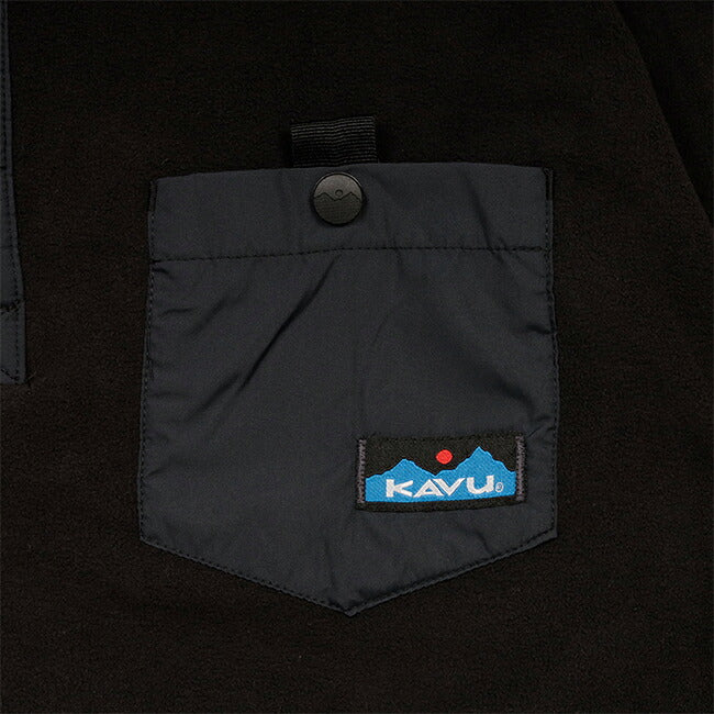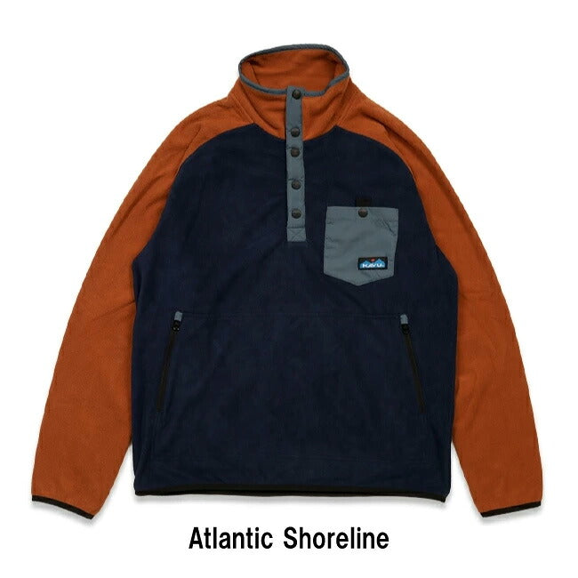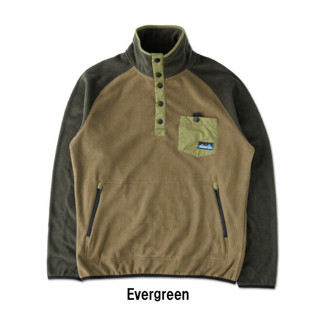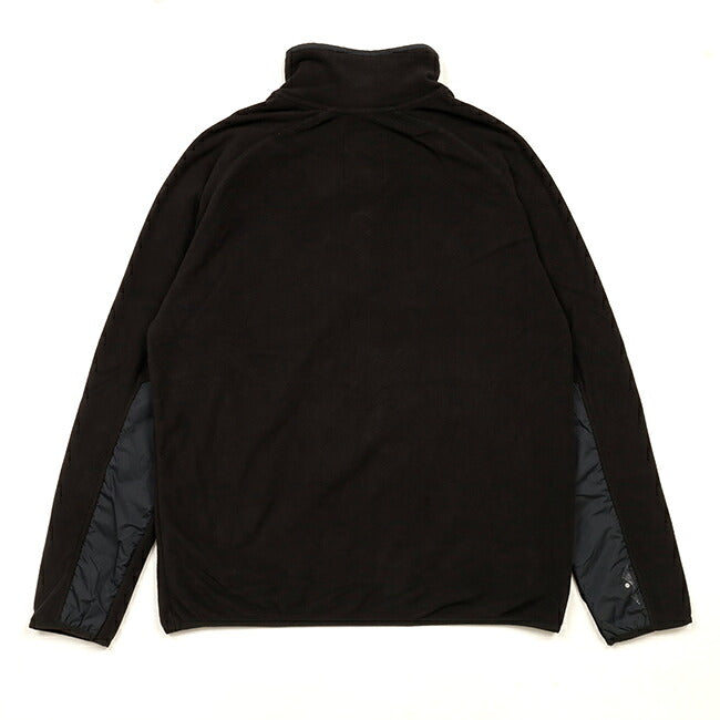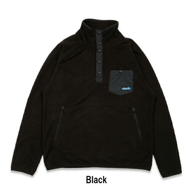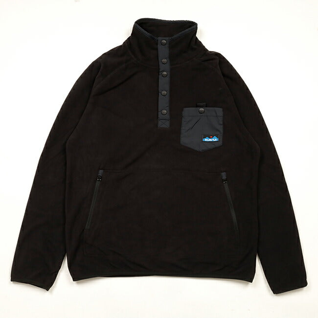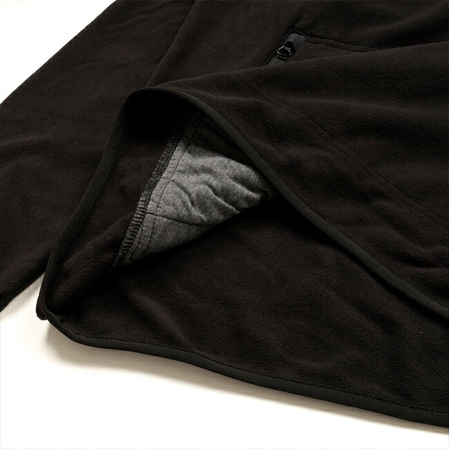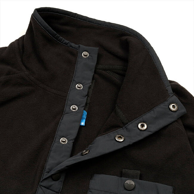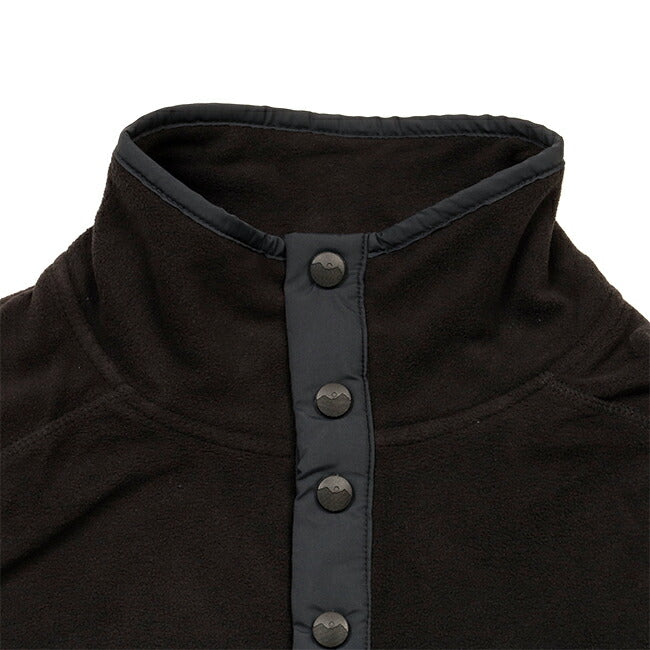 スナップボタンで首元の温度調整ができるフリースで、左胸にはスナップ式のポケットが付いています。