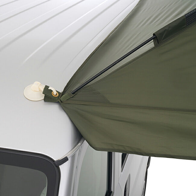 吸盤式ジョイントで車と簡単リンク! 車中泊やドライブピクニックに最適。 付属の吸盤式ジョイントで車に手軽に連結できる広々としたタープ。 生地は防水・難燃加工済で、パネルルーフを採用しているので雨水が溜まりにくい。 軽自動車だけでなく、軽バンにも対応。 日差しを遮りプライバシーを保護するサイドウォールも付属。 【性能/特長】 ・吸盤式ジョイントで車と簡単リンク!車中泊やドライブピクニックに最適。 ・パネルルーフは、雨水がたまらずランタンを吊り下げ可能 ・付属の遮光ウォールは天候や日差しに応じて装着面を変えることができます。 ・シートは、防水加工(1800mm)、撥水加工(3級以上)、難燃加工(米国基準CPAI-84適合)、UV-CUT加工(90%以上) 【総重量】 約4.8kg 【セット内容】 フライシート サイドウォール メインフレーム キャノピーポール 吸盤式フック コードロック付き固定ロープ ペグ ロープ 収納バッグ フレーム用収納袋 小物袋 【主素材】 フレーム:グラスファイバー、スチール シート:難燃性ポリタフタ 【耐水圧】 シート:1800mm |