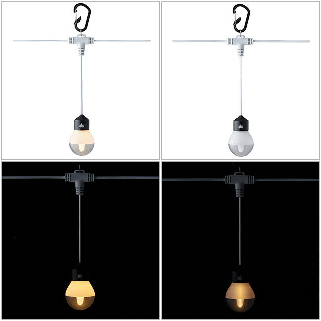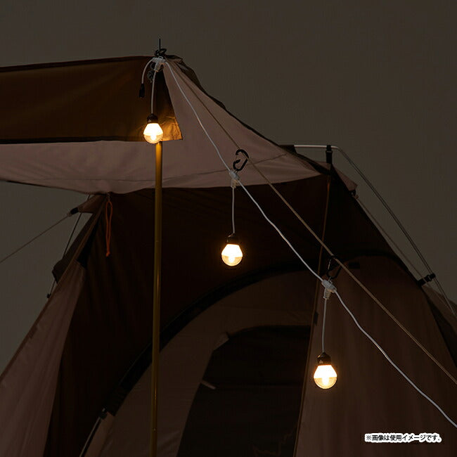 テントやポールに吊り下げられるLEDデコレーションライトの3連タイプ。強、弱、炎のゆらめきをイメージした「ゆらめきモード」の3つの点灯モードから選べ、癒しの空間を演出できる。