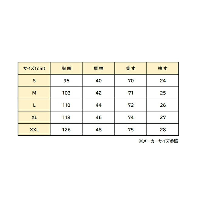 サイズ | S:胸囲95 肩幅40 着丈70 袖丈24 M:胸囲103 肩幅42 着丈71 袖丈25 L:胸囲110 肩幅44 着丈72 袖丈26 XL:胸囲118 肩幅46 着丈74 袖丈27 XXL:胸囲126 肩幅48 着丈75 袖丈28 (cm) ※メーカーサイズ参照 |