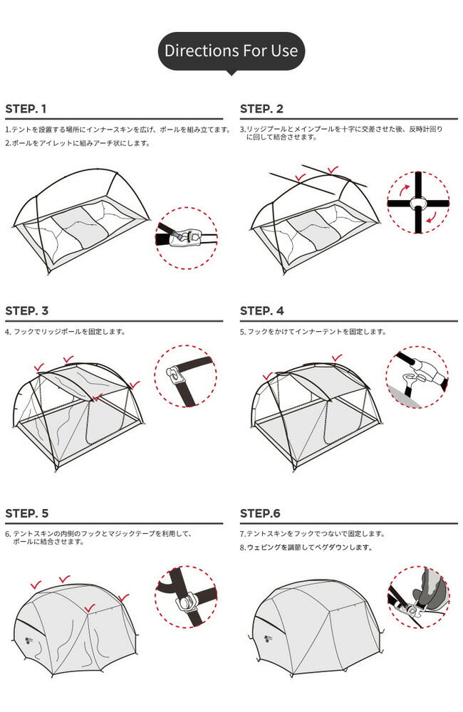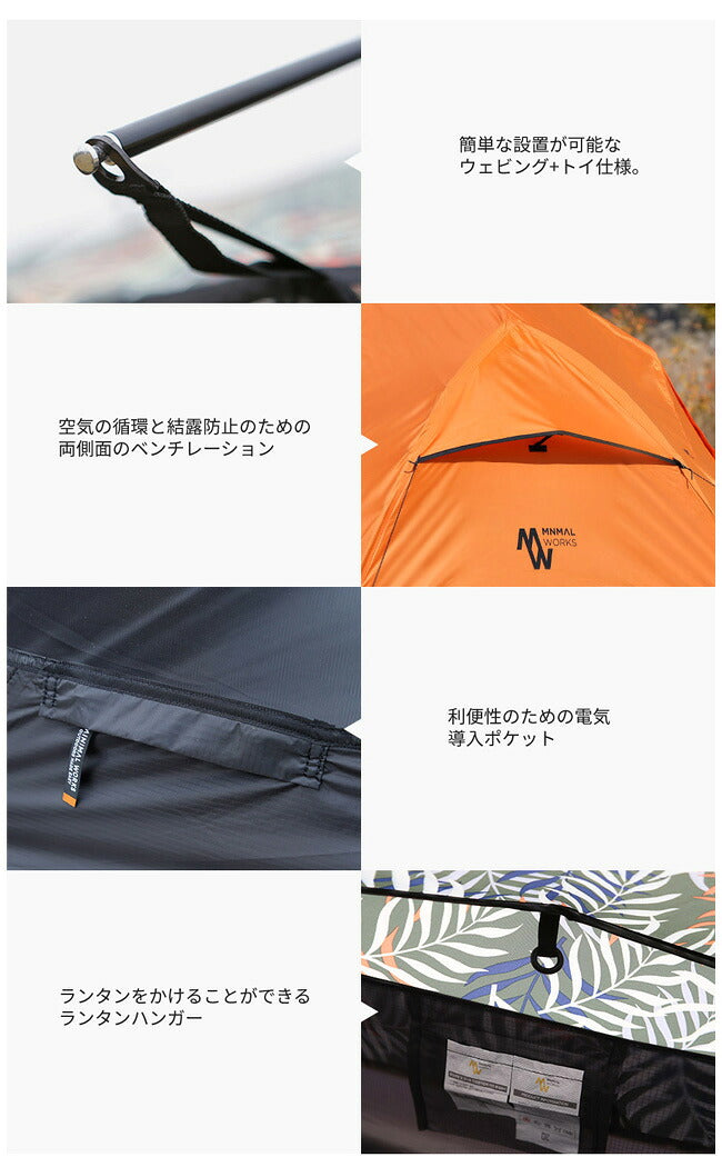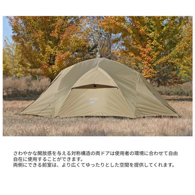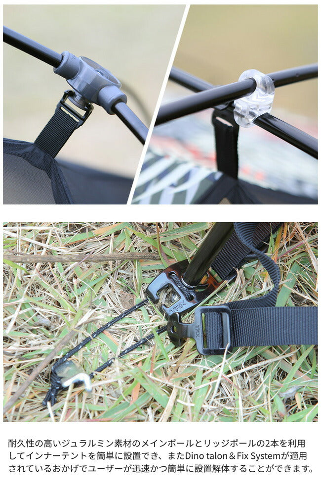 簡単に、素早く設置することができる左右対称構造のダブルウォールテント POMMEは、フランス語でじゃがいもという意味です。 かわいらしいじゃがいもに似たPOMMEは… メッシュインナーテントとフライスキン構造のダブルウォールテントです。 左右対称構造の両サイドのドアは、ユーザーの環境に併せて自由に使用することができ、余裕のある空間を作り出せます。 メインポールとリッジポール2本を使用し、簡単に設置することができ、 Dino talon&Fix systemの作用で、素早く・簡単に設置、解体できます。 【重さ】 2.9kg 【内容】 フライテント・インナーテント・ポール3本・ストリング4本・ピック8本・収納バッグ 【素材】 ポール:ジュラルミン Poly75D Rip PU/WR |