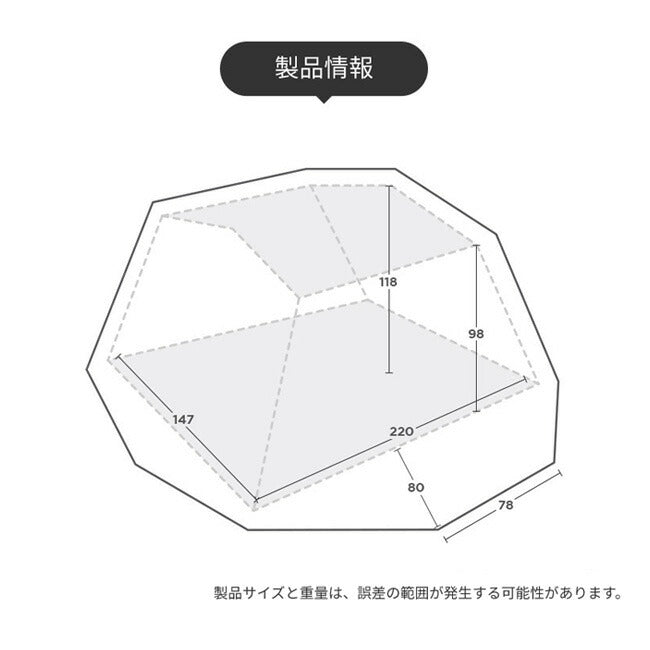 サイズ | インナーテント:220cm×147cm×118cm 収納:55cm×20cm×20cm ※メーカーサイズ参照 |