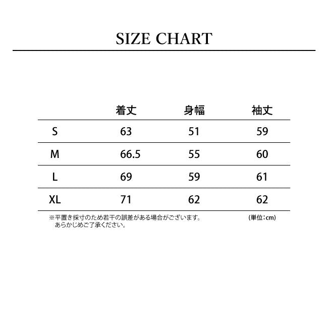 サイズ | S:着丈約63 身幅約51 袖丈約59 M:着丈約66.5 身幅約55 袖丈約60 L:着丈約69 身幅約59 袖丈約61 XL:着丈約71 身幅約62 袖丈約62 (単位:cm) ※平置き採寸のため若干の誤差がある場合がございます。あらかじめご了承ください。 |