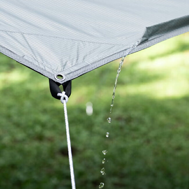 遮光性と排水性に優れたアシンメトリー形状のタープです。 生地の裏面にシルバーカラーのPUコーティングを施すことで 光の透過を極限まで抑え、濃い影を作り出します。 フチには雨どいが付いているので、コーナー部分から雨をスムーズに排出できます。 左右非対称の形状により、テントに連結させた設営に適しています。 様々な気候・地形でテントと組み合わせて最適な形状を作り出すことができます。 2〜4人に適したサイズです。 【Accessories】 - ロープ × 6 - 2又ロープ × 2 - テンショナー × 10 【素材】 40Dリップストップナイロン, シリコン&シルバーPUコーティング, 耐水圧1,500mm 【重さ】 1.6kg 【備考】 *水はけのいい平坦な場所を選んで設営してください。 *強風時や悪天候時には速やかにタープの使用を中止し安全な場所へ避難してください。 *本製品は常設用ではありません。長時間日光に晒された場合、退色や生地劣化などを起こします。 *紫外線の影響と思われる素材の劣化により、耐久限度を超えたものは修理できない可能性があります。 *薄い生地を使用しているため、生地を引っ張りすぎると破損する恐れがあります。 *足元の設営用ロープやペグに引っかからないようご注意ください。 *濡れたままでの保管はカビや異臭、生地の色移り、劣化や汚れなどの原因となります。使用後は必ず風通しのいい日陰で十分に乾燥させ、汚れを落としてから保管してください。 *ペグ・ポールは付属していません。設営には2本のポールと10本のペグが必要になります。 |