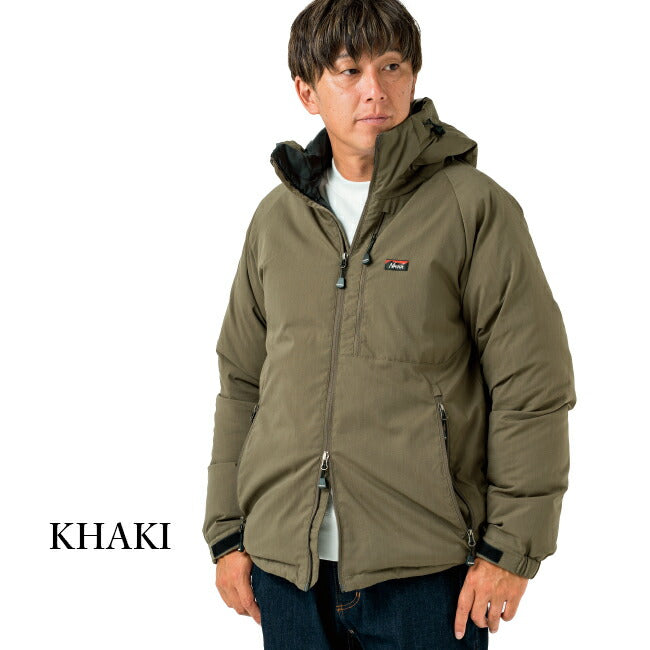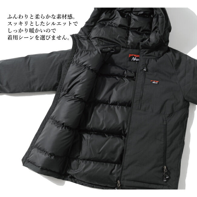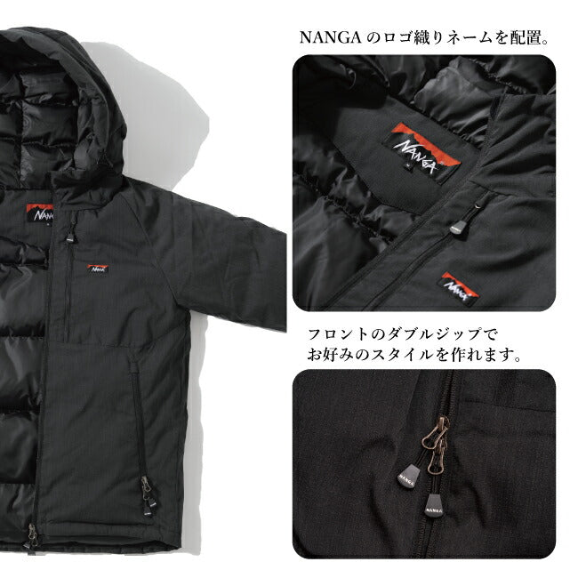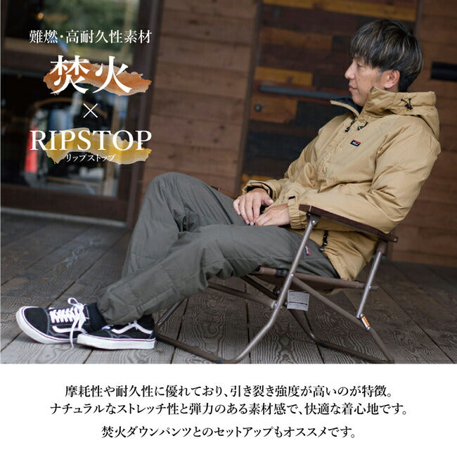 NANGAのフラッグシップモデルAURORATEX DOWN JACKETのフォルムに、難燃素材「焚火リップ」を融合した別注モデル。
