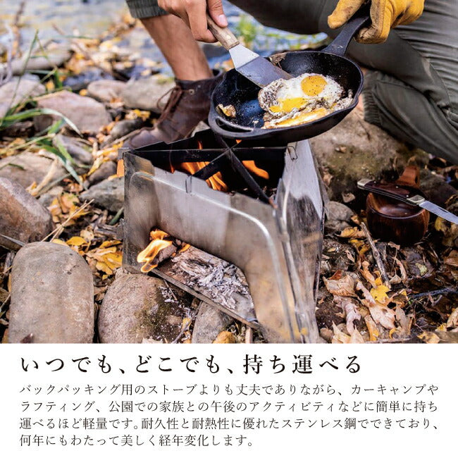 NOBOX ノーボックス フラットストーブはいつでも、どこでも、持ち運べるキャンプストーブです。 バックパッキング用のストーブよりも丈夫でありながら、カーキャンプやラフティング、公園での家族との午後のアクティビティなどに簡単に持ち運べるほど軽量です。 多くのキャンプストーブとは異なり、このポータブルファイヤーピットは、鋳鉄製のスキレットやダッチオーブンなどの重い調理器具の重量に耐えられるように設計されています。 このキャンプストーブは、薪、石炭、ペレットを使用するので、余分な燃料容器を家に置いておく必要はありません。 地面に直接火を起こすことも、ボトムプレートを使って炎を保持することもできます。 丈夫で耐熱性に優れたステンレス製なので、何年も使っているうちに美しい経年変化が楽しめます。 1分以内に組み立てられ、収納時にはフラットになります。 付属の丈夫なナイロン製バッグには、火起こしキットや火種などを入れておくことができます。 ●特徴 ・簡単な組み立て ・木、石炭、またはペレットを使用可 ・頑丈な三脚のデザイン ・鋳鉄のような重い調理器具に耐えるように作られています ●SPEC 重量:約2494g 本体素材:亜鉛メッキコーティングされたステンレス鋼 収納袋素材:ポリエステル(ナイロン混紡) 付属品:収納袋 |