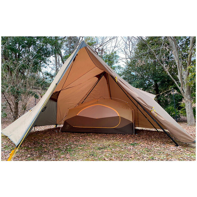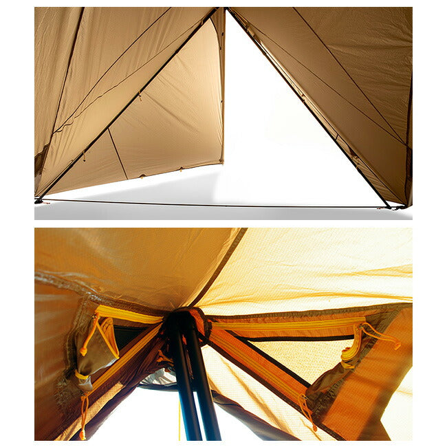 中央部に支柱(ポール)がなくなるため、内部の有効スペースが大幅に拡大し、コットや小型のテントなどをヘキサライト の中に自由に配置することができるようになります。