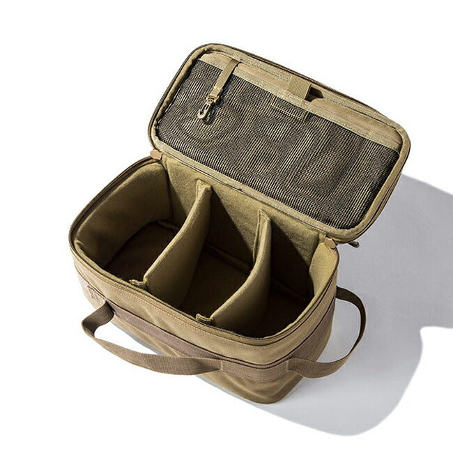 オイルランタン・ガスカードリッジなど、大型ギアの収納に最適なセミハードギアバッグです。 内部には、ポケットとベルクロで組合せを自由に変えられる仕切り付き。 蓋の裏側にはフックを追加しました。 素材:TP-700 POLYESTER(ポリエステル) |