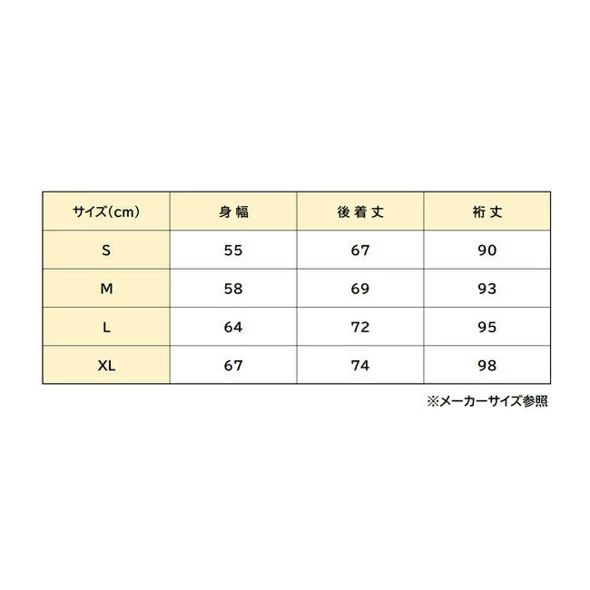 サイズ | XS:身幅52 後着丈64 裄丈88 S:身幅55 後着丈67 裄丈90 M:身幅58 後着丈69 裄丈93 L:身幅64 後着丈72 裄丈95 XL:身幅67 後着丈74 裄丈98 (単位:cm) ※メーカーサイズ参照 |