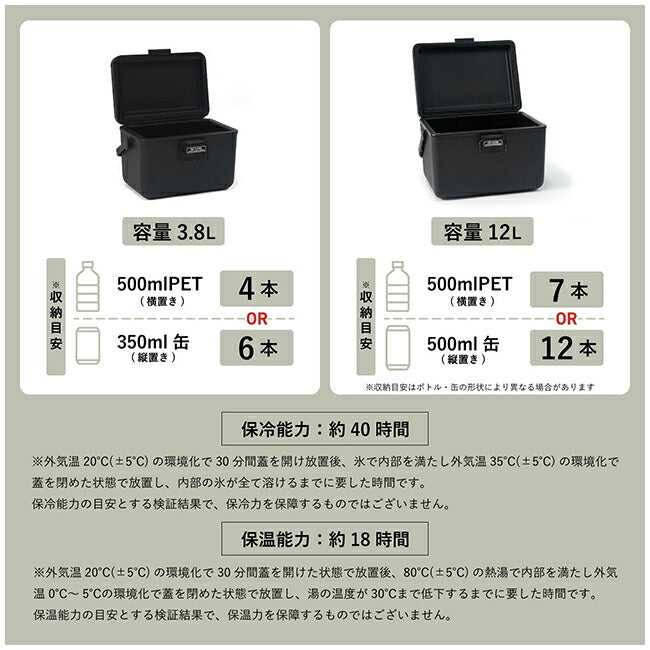 SIMPLE IS BEST. シボ入りの樹脂表面で、シンプルながらも存在感のある雰囲気のクーラーボックスです。 12Lサイズのクーラーボックスには500ml缶が縦置きで12本収納できます。 また、別売りのTHE ICE ERA COLD ICE BRICK に6缶セットした状態での収納が可能です。 【ATTENTION】 ・ハンドルと本体が多少干渉する場合があります。予めご了承ください。 ・クーラーボックスは保冷、保温どちらの用途でもご使用頂けます。ただし冷たい物と熱い物を同時に入れないで下さい。 ・鋭利なものを入れないで下さい。 ・汚れた際は水拭きして下さい。強酸性、強アルカリ性の洗剤や漂白剤は使用してないで下さい。変質、劣化の原因となります。 ・本品に座ったり、立ったりすることは絶対におやめください。 ・火器や高温になるものに近づけないでください。火災や本品の変質、変形の原因となります。 ・使用しない際は内部を清掃し、直射日光が当たらない場所で保管して下さい。 【MATERIAL】 POLYPROPYLENE、POLYURETHANE 【重量】 1650g |