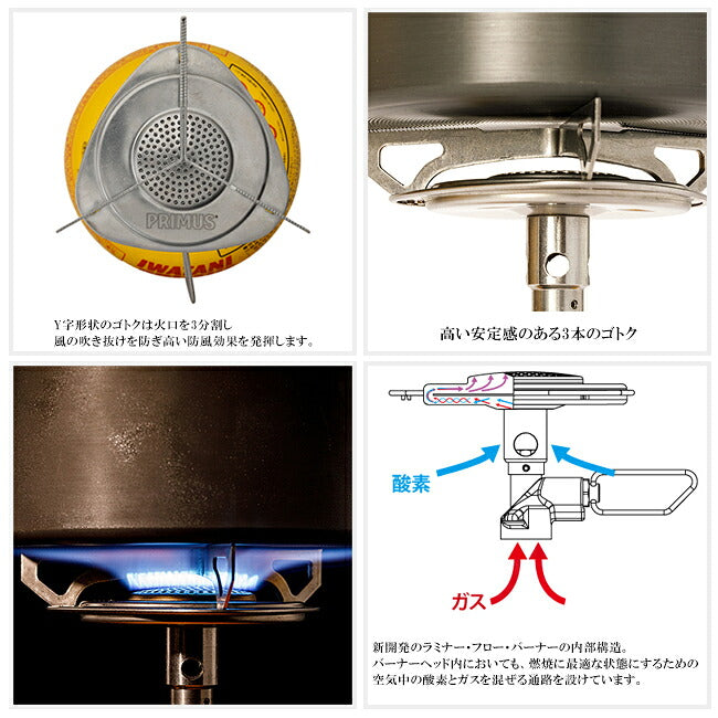 エントリーユーザーからエキスパートまで、全てのユーザーのエッセンシャル(必須)プロダクトとなることを目指してプリムスが開発したシングルバーナーです。新開発のラミナー・フロー・バーナーテクノロジーを採用して全高を低くすることで重心を下げ、一般的なシングルバーナーよりも高い安定性を実現しました。堅牢かつ可動部を最小限に抑えたシンプルなデザインにより、直感的に素早く使用でき、また長期にわたるハードな使用における破損のリスクも減らしています。キャンプや登山、ツーリングなど様々なシーンで幅広く活躍します。 出力:2.6kW/2,200kcal/h(Tガス使用時) ガス消費量:183g/h 燃焼時間:約75分(IP-250タイプガス使用時) 本体重量:113g ※圧電点火装置は装備しておりません。 |