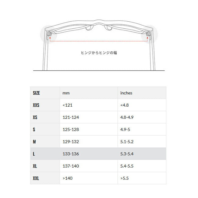サイズ | 【ヒンジからヒンジの幅】 135mm 【レンズ高さ】 46.6mm 【レンズ ブリッジ幅】 53 20mm 【テンプル長さ】 150mm |