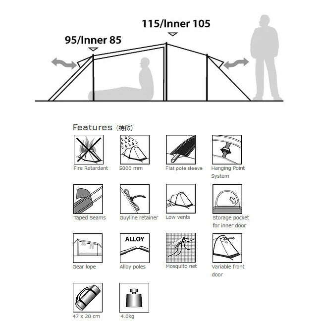 ROBENS ボイジャー 3EX 3人のキャンパーのために大型で快適なリビングスペースを備えた”ROBENS VOYAGER 3EX”。 2つの大型ドア(メッシュ付)と広い前室を持っているため、悪天候時にも余裕をもって過ごすことができます。前室のフロント部にも小型のドアが装備されていますので通気性に優れているだけでなく天候に応じて様々な設営方法を選択して頂けます。吊り下げ式のインナーテントには、ギアロープやストレージポケットなどの便利な装備も付いています。なによりも、MAX189kmの風速にも耐えられる強靭なテントです。Technical Specification (詳細)テントタイプ : トンネル 就寝人数 : 3人 テント素材 : フライ / ハイドロテックス HD, 75D ポリエステル 185T 遅燃性, 5000mm インナー / 68D ポリエステル 190T 通気性 部屋数 : 1ベッドルーム & 1ポーチエリア ポール : アロイ #7001, T6, 8.5mm アナダイズド フロア : 75D ポリエステル タフタ 210T , 耐水圧 10000mm |