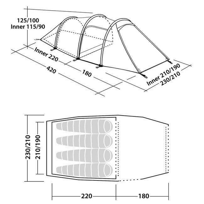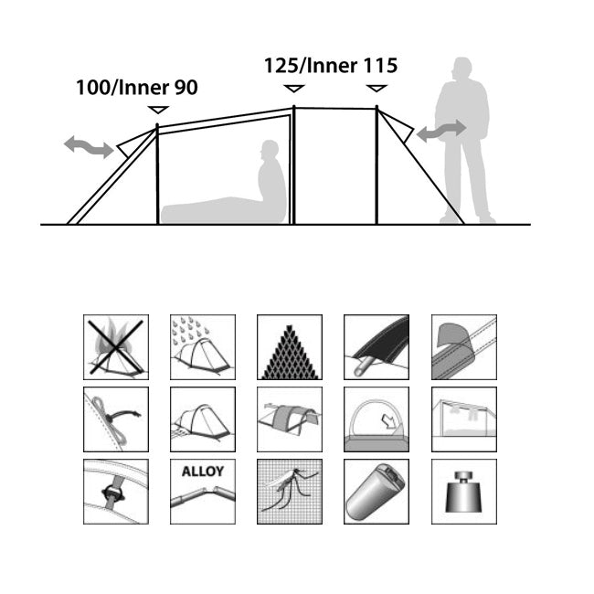 収容人数 最大4人 素材 フライ / ハイドロテックス HD, 75D ポリエステル 189T 遅燃性, 5000mm インナー / 68D ポリエステル 190T 通気性 |