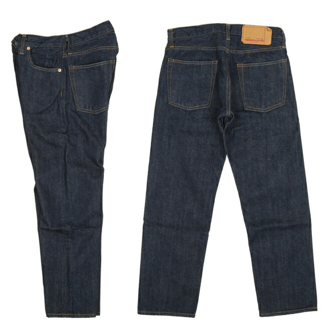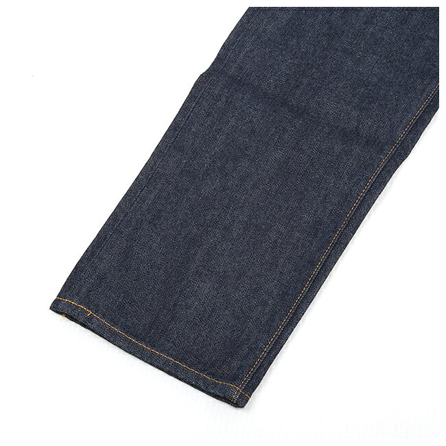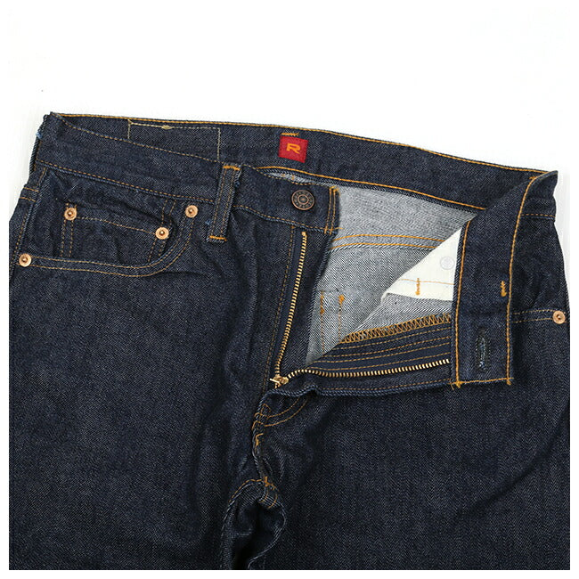 股上がやや浅く、膝から下がテーパードされているストレート。 生地に防縮加工(サンフォライズド)を施し、洗うたびに出る毛はあらかじめ焼いてある。 ジッパーフライ。 |