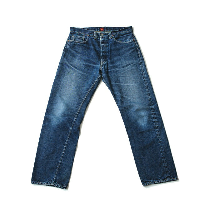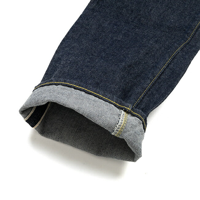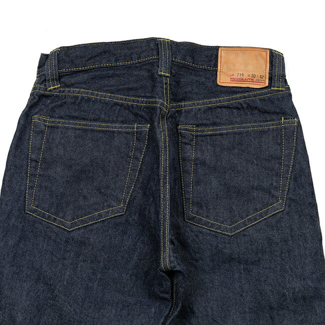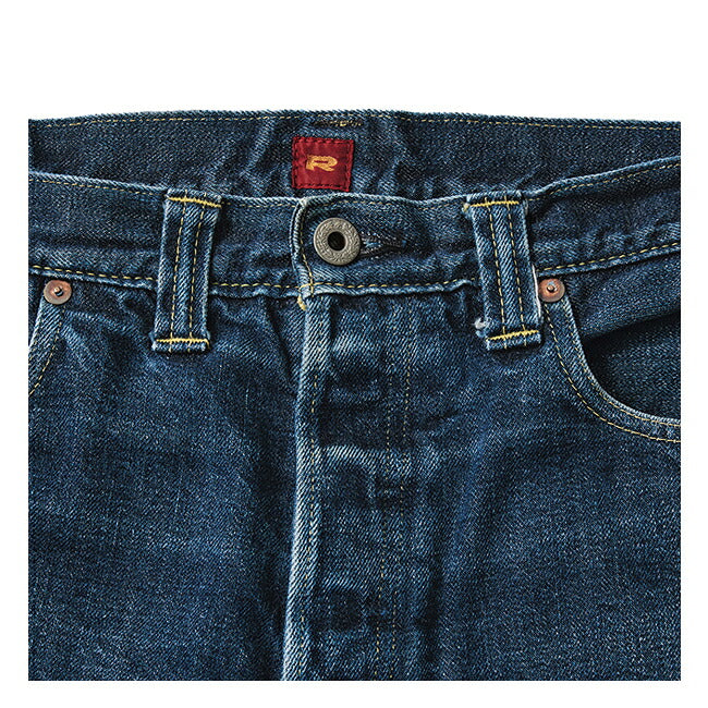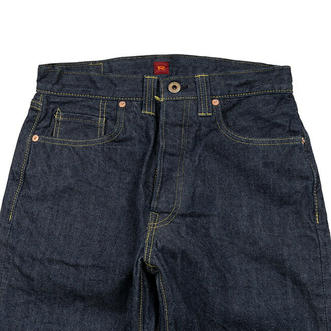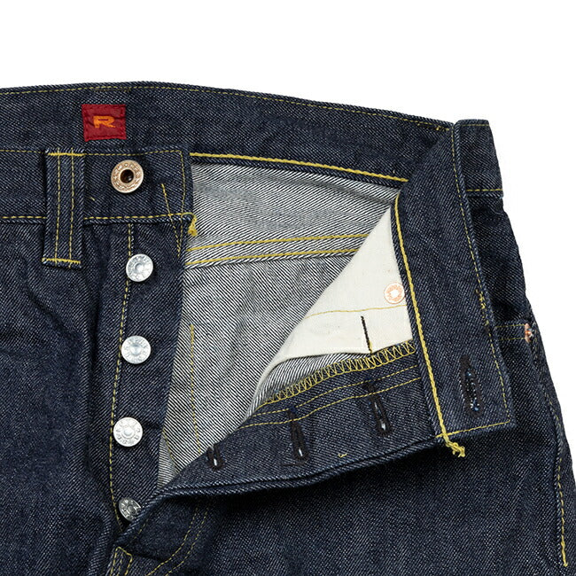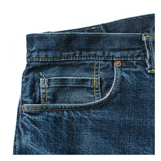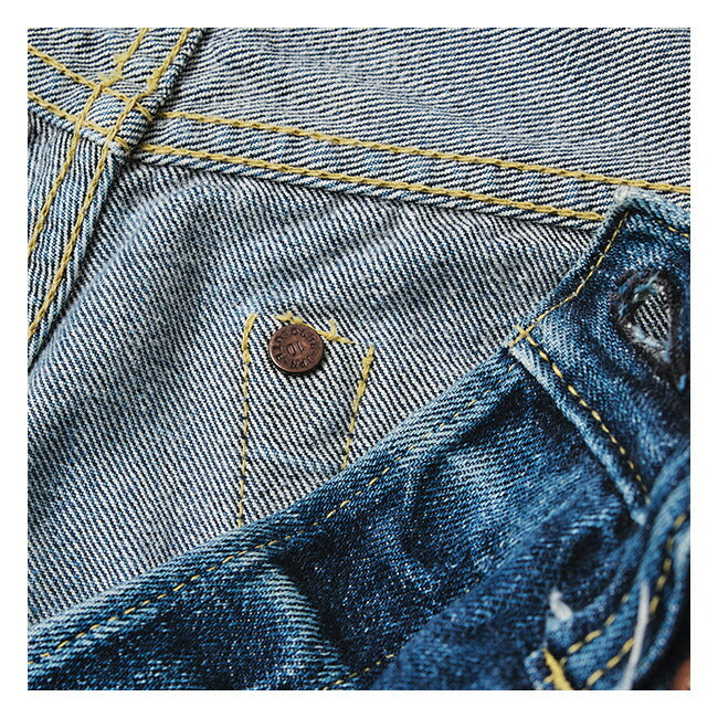 第二次世界大戦下のアメリカで、物資統制によってさまざまな仕様の簡素化が余儀なくされた通称「大戦モデル」。 戦時中の生産背景から生まれたそれには、統一性のない多種多様なタイプが存在します。 RESOLUTEでは、月桂樹が刻印されたドーナツ型トップボタン、リベットなしのコインポケット、太めのベルトループといったヴィンテージ大戦モデル特有のディテールを踏襲。 ウエスト位置を高めてヒップを包み込むようなシルエットに仕上げました。 |