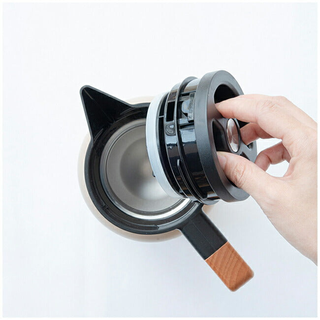 人気の卓上魔法瓶ポット「キート」のセカンドモデルが登場。 これまでの課題を解決して、使い勝手を向上させました。 最初に取り組んだのはフタの洗浄/乾燥をより簡単に行えるようにすること。 これまでのフタは分解が出来ず、フタ内側に浸水してしまうと、内側を完全に乾かすのにとても長い時間が必要でした。 フタを簡単に分解できる構造にすることで、メンテナンス性を向上させようというもの。 蓋の裏側を二本の指で挟んで軽く押すだけで、フタがぽろっと外れて中身が丸見えになります。 専用工具も必要なく、とても直感的。 気になるところまでしっかりと洗浄して乾燥が終われば、押し込むだけでパチンと容易に戻せます。 ウッドハンドルが見た目の大きな特長でもある製品ですが、天然木故に水に濡れると、水分を含んで膨張やひび割れをおこしたり、塗装が剥がれてしまうトラブルがありました。 そこでコーティング剤を見直し、家具などにも使用されるハイグレードの塗料に変更。 ハンドルの美しさを長く保てるようになりました。 原材料:18-8ステンレス鋼(本体、フタ)、ポリプロピレン(本体、フタ)、ビーチウッド(ハンドル)、ポリアセタール(フタ)、シリコーンゴム(フタ、ハンドル)、ステンレス鋼(フタ、ハンドル) 容量:1200ml 重量:約788g 保温効力:56℃以上(10時間) 保冷効力:7℃以下(6時間) |
