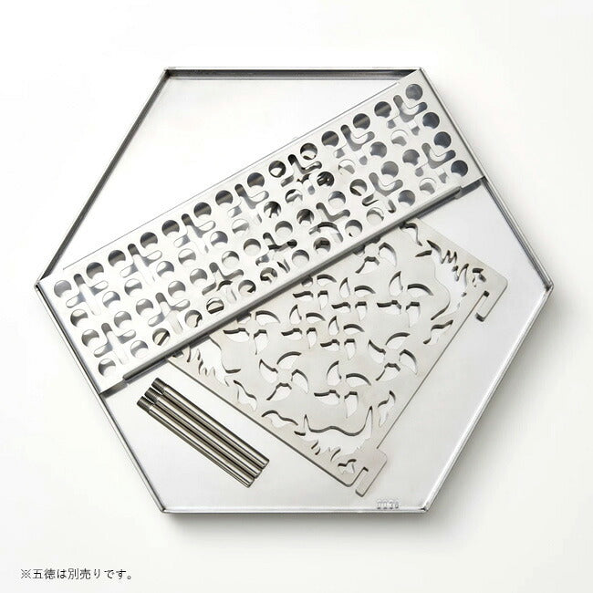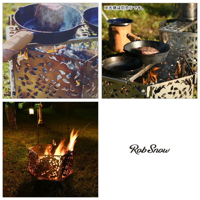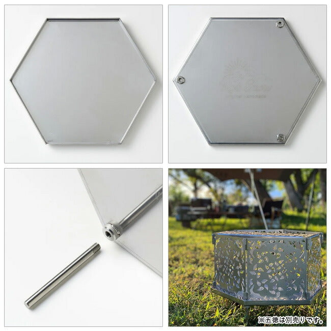 暗闇の中を踊る炎の美しさをより引き立てるとご評価頂いている組み立て式の焚き火台で、手裏剣をモチーフにしたデザインに仕上げています。 素材には、高い強度と耐熱性を併せ持ち、クロムという金属によって保護膜を作ることで錆びにも強い特性も備えるステンレスを使用しています。 購入直後はキラキラとした金属光が眩しく、使い続けることで焼きが加わり、十人十色の風合いを醸すようになっていきます。 ご購入頂いた焚火台にはひとつひとつシリアルナンバーを刻んでおりますので、「Only one in the world」のコンセプト通り、世界に一つ唯一無二の焚火台になります。 組み立て式になっておりますので、六角形の側面プレート、脚、底板の3つのパーツに分離することで収納もコンパクトに、持ち運びも簡単に行えるようにしております。 専用のオプションパーツ(別売)として五徳もご用意していますのでKen-shuriを使っての焚き火料理も可能です。 火力の強弱や経年変化によって様々な表情を見せてくれるken-syuriをぜひ末永く愛用頂けたらと思います。 ※こちらの商品の素材は「ステンレス」になります。 [重量] 約6.4kg [素材] 本体:ステンレス ※ご使用上の注意※ ご使用時はグローブなどを装着したうえで、組立や片付けを行ってください。 また焚火台ご使用時及び使用直後は本体及び付属品は大変熱くなります。 火傷等にご注意願います。 高温の状態の焚き火台及びゴトクに水をかける等の行為を行いますと、歪みや変形の原因となりますのでお控えください。 ひとつひとつ手作りのため制作上の傷がつく場合がございます。 ご了承ください。 |