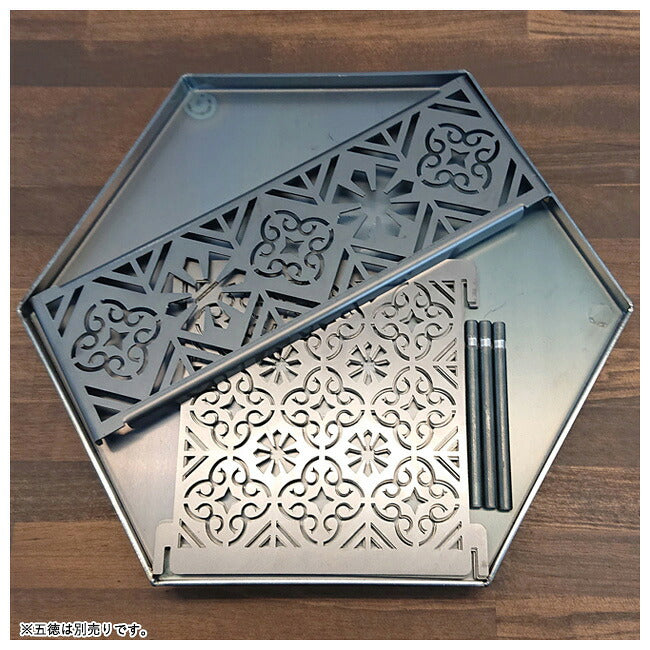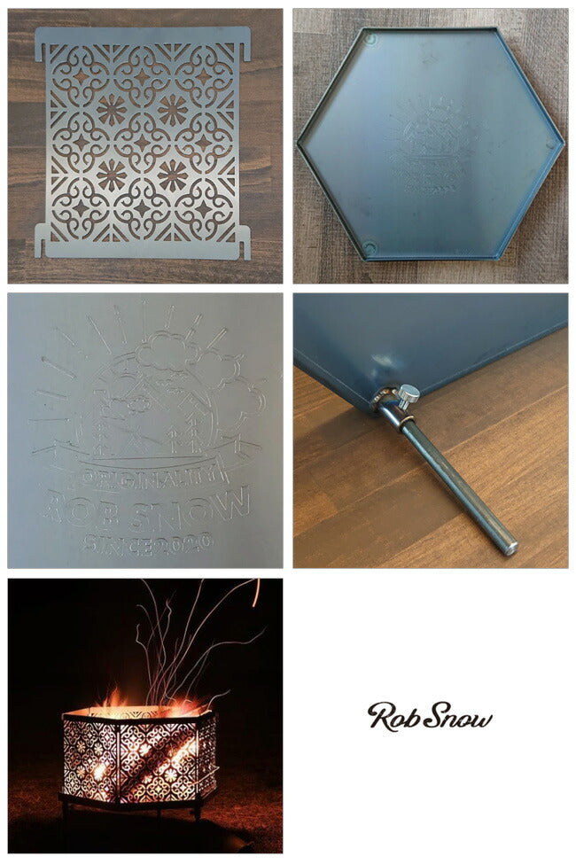 「焚き火やキャンプをより女性にも楽しんで頂きたい」をコンセプトに立ち上げたガールズライン、組立式焚火台「Rabat(ラバト)」です。 Rob SnowのKen-Shuriよりもサイズを一回り小さくし、軽量化を図ることで女性でも持ち運びや組み立てを行えるように調整しました。 デザインには、テント内に敷くラグやテーブルマットなどでも多く見かけるようになったモロッカン柄をあしらい、他のギアとの共存を図れるデザインにしました。 素材には落ち着きと無骨な印象が人気の黒皮鉄を使用していますが、モロッカン柄の持つ可愛らしさと焚火台にしては少し小ぶりなサイズ感が合わさり、まったく異なる印象を感じます。 オプションパーツとして、Rabat専用五徳(ゴトク)もご用意しております。 焚き火料理を楽しみたい女性キャンパーの方にも最適です。 Rabatを使うことで焚き火やキャンプのひとときをより素敵な時間にしていただければ幸いです。 是非、お試しください。 ※サイズが異なるためKen-Shuri,Macha用の五徳はご利用頂けません。 五徳も併せて購入される方は、必ずRabat専用の五徳をご購入ください。 ※Rabatに使用している黒皮鉄の性質上、色ムラや軽度の変色が生じることがございます。 過度な変色に関しては事前に除外し、品質上問題のない製品を出荷しておりますが、金属製品の特性をご理解した上でのご購入をお願い申し上げます。 [重量] 約4.36kg [素材] 本体:黒皮鉄 ※ご使用上の注意※ ご使用時はグローブなどを装着したうえで、組立や片付けを行ってください。 また焚火台ご使用時及び使用直後は本体及び付属品は大変熱くなります。 火傷等にご注意願います。 高温の状態の焚き火台及びゴトクに水をかける等の行為を行いますと、歪みや変形の原因となりますのでお控えください。 ひとつひとつ手作りのため制作上の傷がつく場合がございます。 ご了承ください。 |