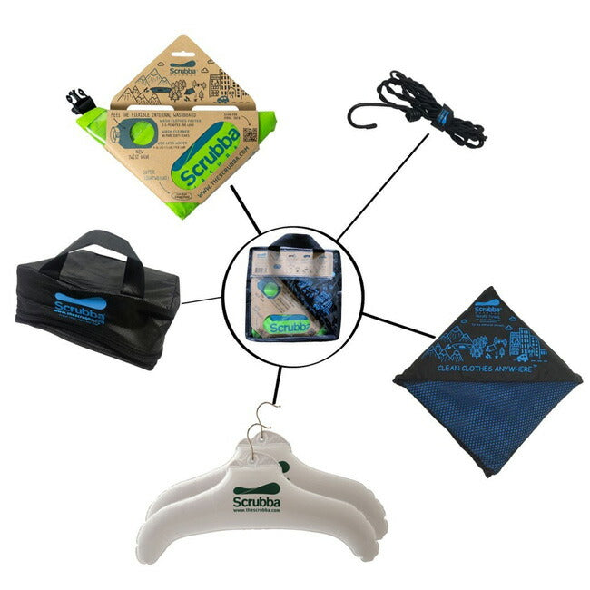 旅先での衣服の洗濯と乾燥に必要なものを、すべてセットにしました。世界最小の洗濯機、スクラバウォッシュバッグで洗ったら、特大サイズのスクラバ・タオルで水気を切り、スクラバ洗濯ロープに洗濯物を干します。空気で膨らませるスクラバ・ハンガーも同梱されています。