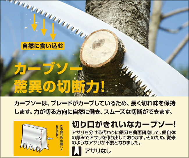 比較的荒い目数がカーブソーにより切れ味(切断スピード)を高めるため、剪定に最適です。 切り口は絹のようになめらかに仕上がるので、皮巻きが早まり、病気から木を守ります。 目数 8枚目 切幅 1.2mm ※ナイフ刃物類の販売に関して -ナイフ・刃物類は18歳未満の方へは販売しておりません。 -刃物を正当な理由なく携帯するくことは法律によって禁止されています。 -販売は登山・キャンプなど正当な仕様目的を有した方のみとさせていただきます (銃砲刀剣類所持等取締法第22条) |