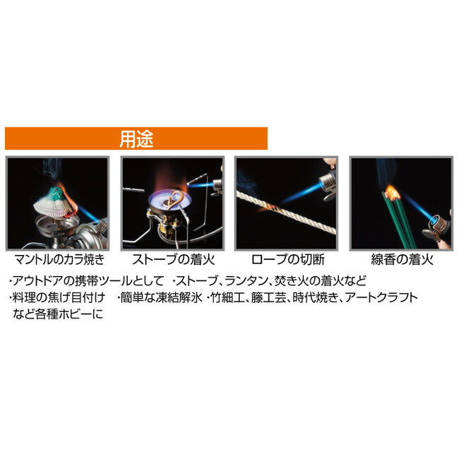 手のひらに、すっぽり収まる超小型強力耐風バーナー コンパクトな火口タテ型モデル 燃料は充てん式。カセットガスからの充てんもできます。 ※気温が低い時はライター用ガスが有効です。 ※ボンベは別売です。 ●ガス消費量 7g/h※1 ●ガス充てん量 約1.2g/h ●発熱量 0.09kW(80kcal/h)※1 ●火口径 φ14mm ●火炎温度 1300℃ ●点火方式 圧電着火方式 ※1 当社実験室データによる。 20秒以上の連続使用はしないでください。やけど、器具の破損の原因となります。 |