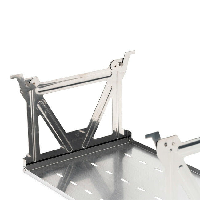 収納スペースを拡張できるラック。 ロースタイル対応モデルが登場。 IGTフレームにセットし、テーブル下の空間を有効活用できるラック。 IGTの高さ、400/660/830脚に対応しています。 ロースタイルからハイスタイルの400〜830脚の高さまで対応しています。 ハンガー部分と天板部分が一体型となっているため、パーツも少なくスムーズに設置が可能です。 また、収納や設置が容易な折り畳み式を採用。 また、水切りができるよう、プレートには穴が開いています。 調理器具や食材などを手に届く範囲に置くことができ、より快適なキャンプを実現します。 【重量】 2.5kg 【耐荷重】 5kg 【材質】 ステンレス ※本製品はCK-150 IGT アイアングリルテーブル フレームロングに2台設置できません。 製品同士が干渉しますので、1フレームに対し、本製品1つのみ設置してください。 |