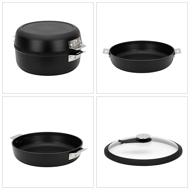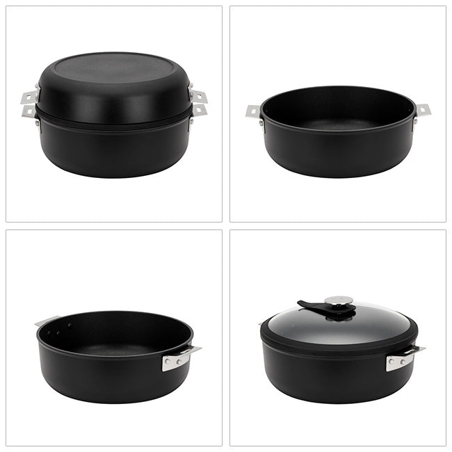 キャンプの食事づくりを、もっと気軽に、楽しく。 ガラス蓋の保護と、料理の持ち運びを同時に実現。 フタをガラス製にすることで、調理をより便利に楽しく。 そして、家でできる限りの下準備を済ませて外で火にかけるだけで済めば、時間も短縮で着て、キャンプ用のまな板や包丁が揃っていない人でも簡単に美味しい食事が楽しめます。 家とキャンプ、その境界をつないでくれるアイテムです。●セット内容:鍋・フライパン・ガラス蓋・ハンドル・収納ケース・収納ベルト ●材質:本体/アルミニウム合金(フッ素樹脂加工・セラミック焼付塗装)、鉄・アルミニウム溶射、蓋/強化ガラス・シリコーン、つまみ・ブラケット・ハンドル/ステンレス |