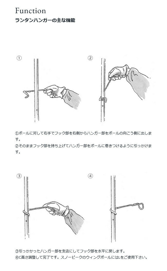 アルミポールに巻き付けてセットする便利なハンガー。 ポールにくるりと巻くだけ。 荷重がかかることによってしっかり固定されます。 ランタン、タオル、ゴミ袋、ハンマーなど、なんでも自由にかけられる名脇役です。 重量:120g 【仕様】 ●材質:ステンレス、塩化ビニールコーティング ●取付可能ポールサイズ:φ27〜32mm |
